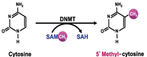 DNA由4种碱基构成,分别为胞嘧啶(C)、胸腺嘧啶(T)、腺嘌呤(A)、鸟嘌呤(G)。DNA甲基化是最早发现的基因表观修饰方式之一,真核生物中的甲基化仅发生于胞嘧啶。DNA甲基化是指由DNA甲基转移酶(DNMT)介导,在胞嘧啶的第5位碳原子上加上一个甲基基团(-CH3),使之变成5-甲基胞嘧啶(5-mC)的化学修饰过程。DNA甲基化通常抑制基因表达,去甲基化则诱导了基因的重新活化和表达。这种DNA修饰方式在不改变基因序列前提下实现对基因表达的调控。